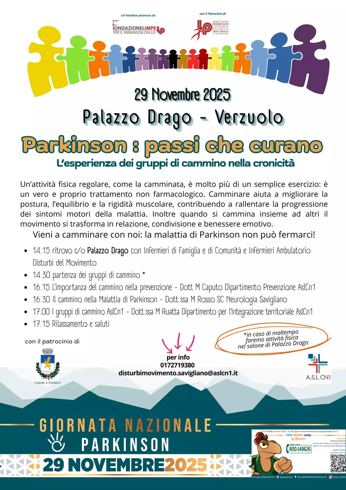 Sabato 29 novembre, in occasione della Giornata della Malattia di Parkinson 2025, la Struttura Complessa di Neurologia Asl Cn1 di Savigliano con il patrocinio del Comune di Verzuolo e della Società Italiana Parkinson e disordini del movimento LIMPE-DISMOV, organizza l'evento "Parkinson: passi che curano".