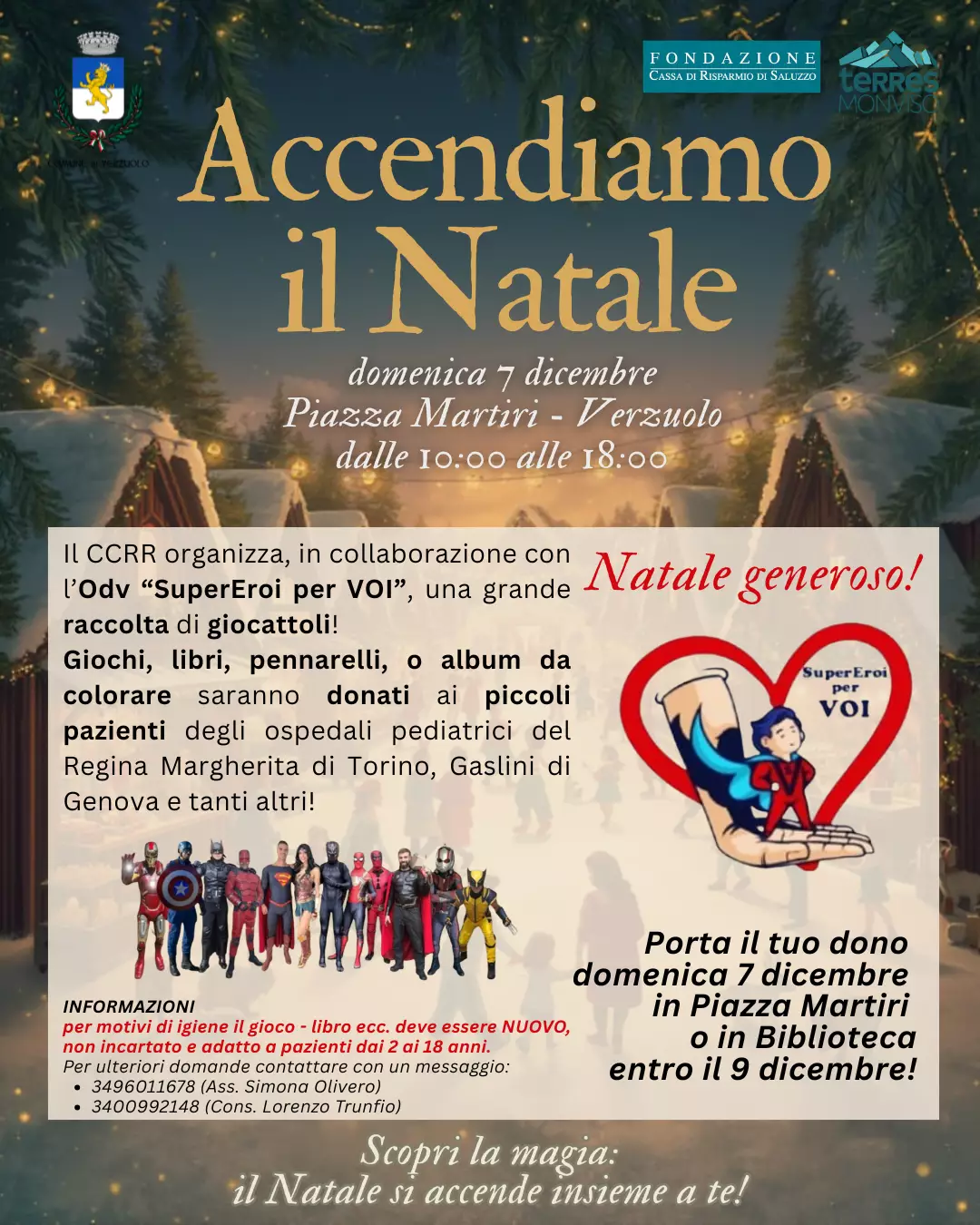 Il vero protagonista di questa giornata sarà lo spirito di altruismo. In collaborazione con l'Odv "SuperEroi per Voi", il CCRR ha organizzato una grande raccolta per portare gioia a chi ne ha più bisogno. L'appello è a tutti i cittadini: portate giochi, libri, pennarelli o album da colorare nuovi, e diventate un "SuperEroe per Voi". Questi doni verranno infatti consegnati ai piccoli pazienti pediatrici in ospedali come il Regina Margherita di Torino e il Gaslini di Genova. È un gesto semplice, ma potente, per accendere un sorriso. I regali potranno essere lasciati domenica 7 dicembre in Piazza Martiri o in Biblioteca fino al 9 dicembre. Si ricorda che per motivi igienici, si accettano solo oggetti nuovi e non incartati, adatti a bambini e ragazzi dai 2 ai 18 anni.