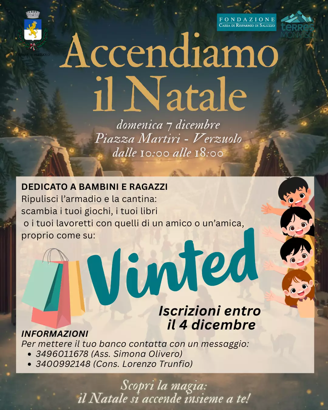 Dalle 10:00, Piazza Martiri si trasformerà in un villaggio incantato. Tra gli espositori di Hand Made e le associazioni di Volontariato, i visitatori potranno assistere alle magie del Mago Maxim e curiosare tra i banchi delle Pro Loco di Verzuolo e della Villa e l'associazione I Ciat Ca Rampignu che offriranno un assaggio dei sapori più tipici delle feste: gnocchi fritti, tè caldo, vin brulé, bombardino e dolci. I bambini e le bambine avranno il loro spazio speciale con giochi in legno, letture animate, laboratori natalizi e persino la presenza di cavalli e rapaci.