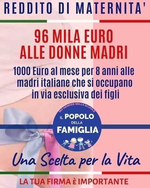 Descrizione Presso gli uffici comunali è possibile firmare la raccolta firme de "Il Popolo della Famiglia" per il reddito di maternità. Per maggiori informazioni visitare il sito http://ilpopolodellafamiglia.net/.
